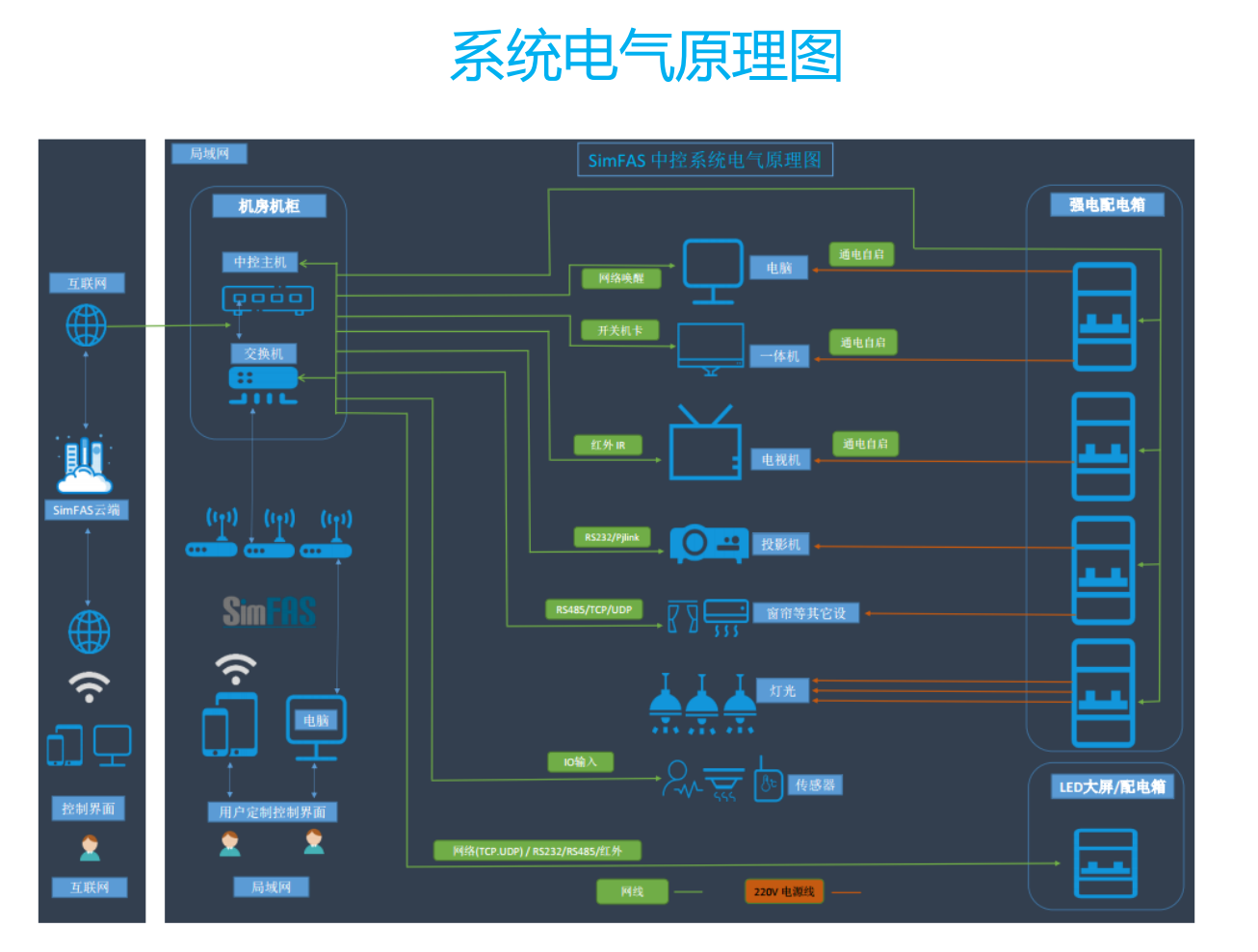 1.现场要控制的每台设备布两根线,1根220V电源线到配电箱,1根网线到中控机柜.